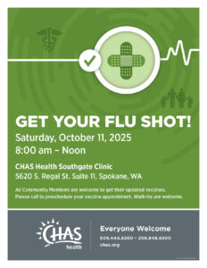 CHAS Health Southgate clinic is hosting a Saturday Immunization Clinic on October 11,from 8:00 am -12:00 pm. Call ahead to schedule your vaccine appointment time at 509.444.8200 , but walk in’s are always welcome. Get your flu shot!